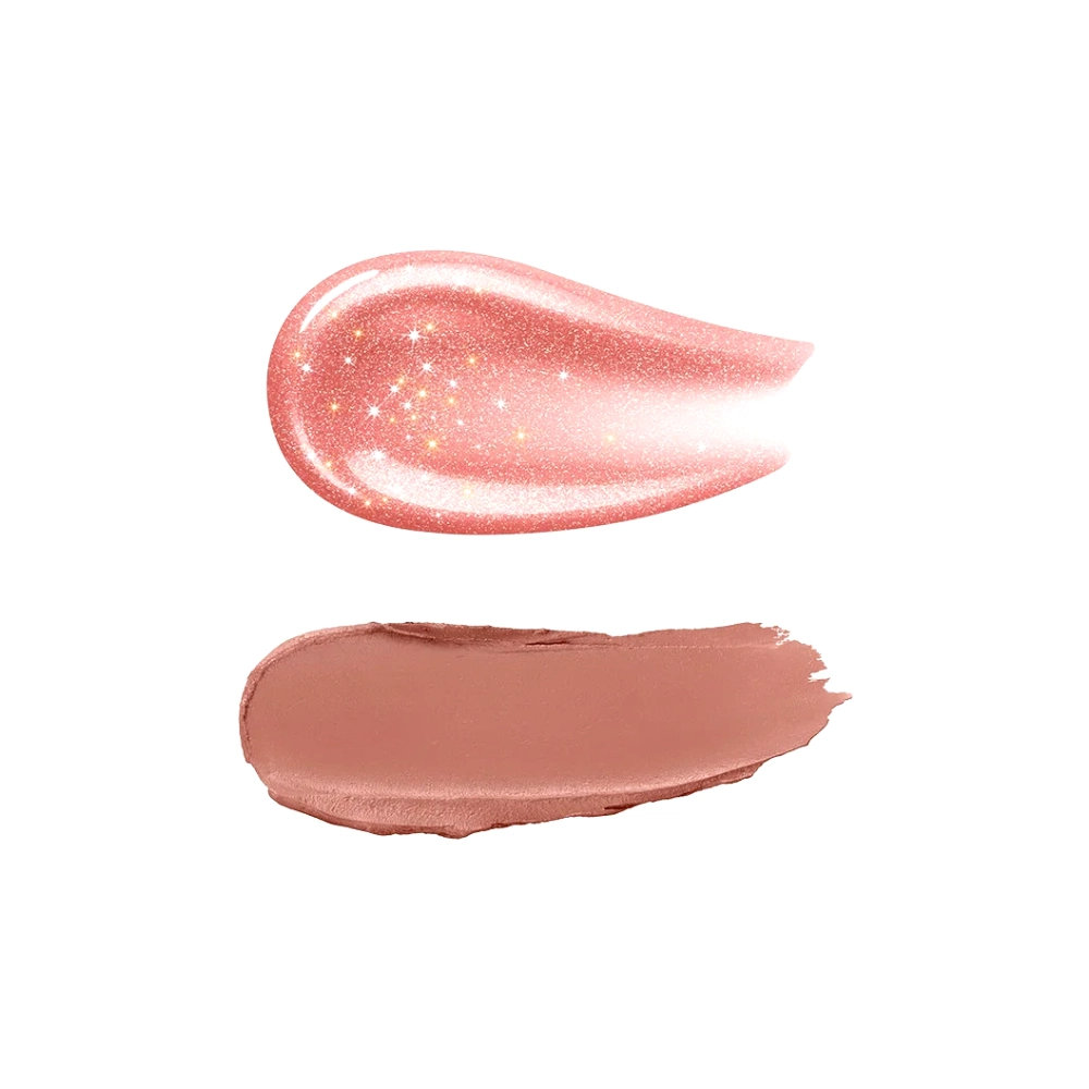 این کیت شامل یک رژلب جامد با بافت سبک و پوشش دهی بالا است و در کنار آن یک لیپ گلاس حجم دهنده و براق کننده دارد.